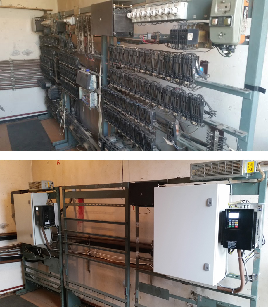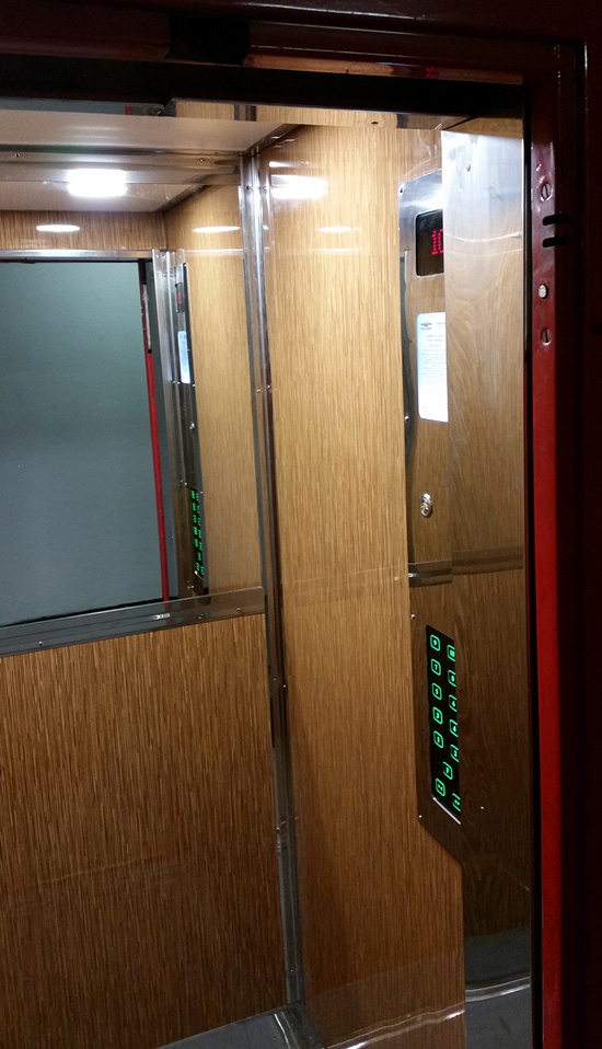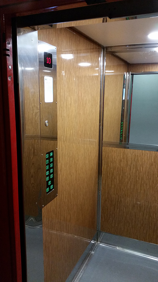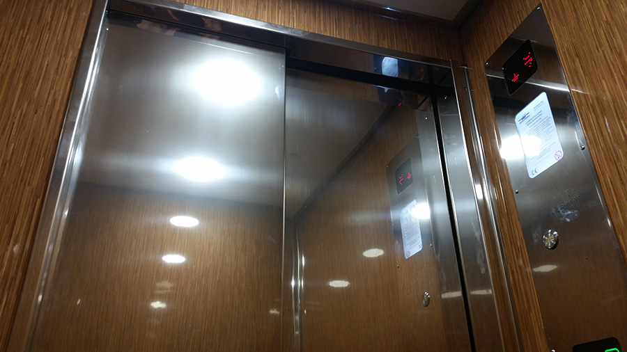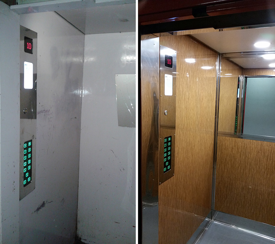 Duplex felvonó hajtásszabályozással. Felvonó vezérlés csere. Felvonófülke burkolás. Földszinti aknaajtók cseréje.